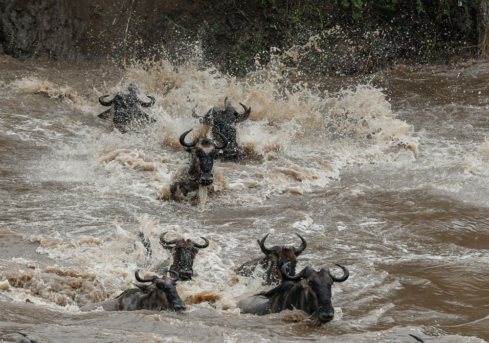 ↑在肯尼亚马赛马拉国家保护区,成群的角马飞奔过河。