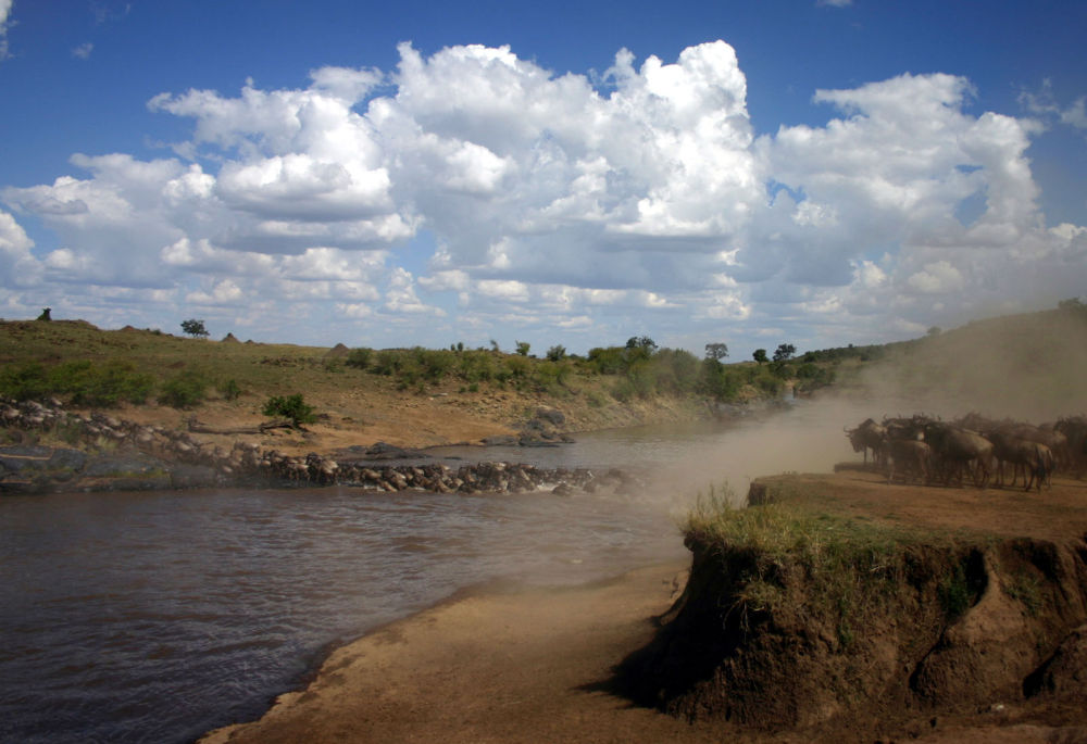 ↑在肯尼亚马赛马拉国家保护区,大批角马横渡马拉河。