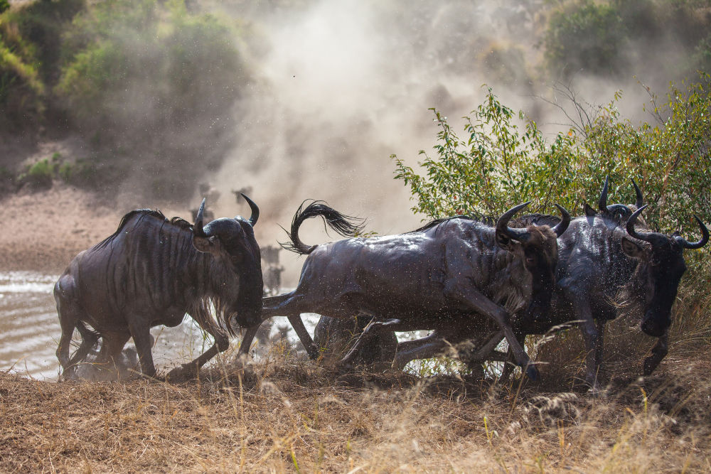 ↑在肯尼亚马赛马拉国家保护区,几只横渡马拉河的角马成功上岸。
