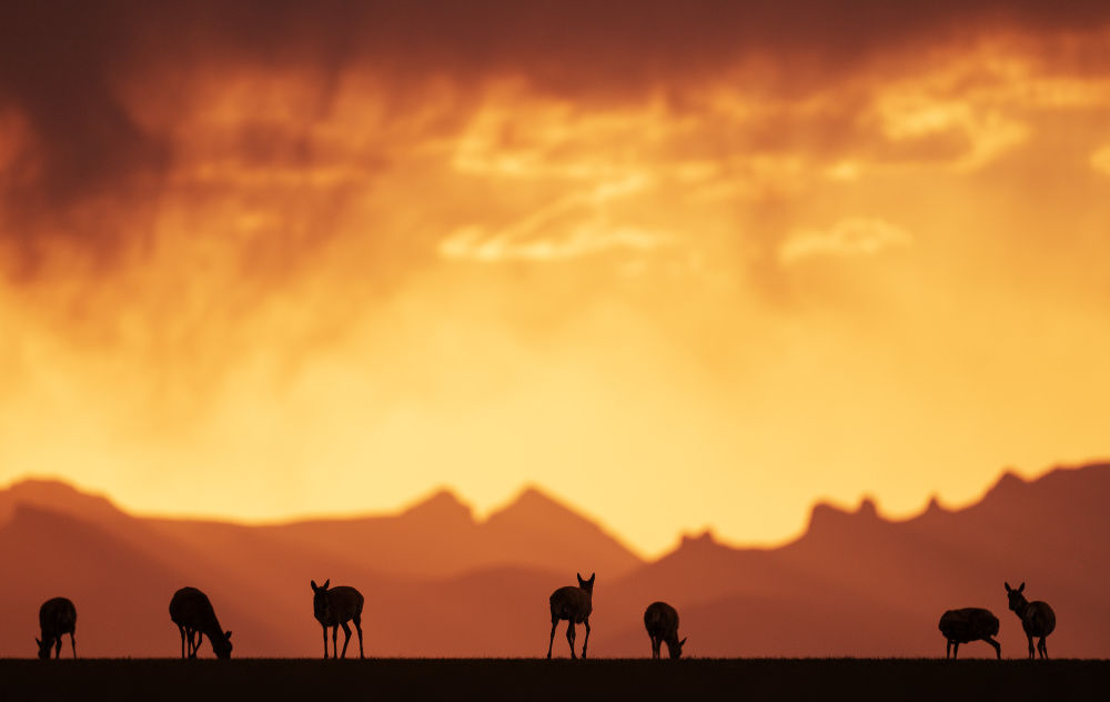 ↑在羌塘国家级自然保护区境内的西藏那曲市申扎县买巴乡鲁确塘草原上,待产的藏羚羊沐浴在晚霞中。