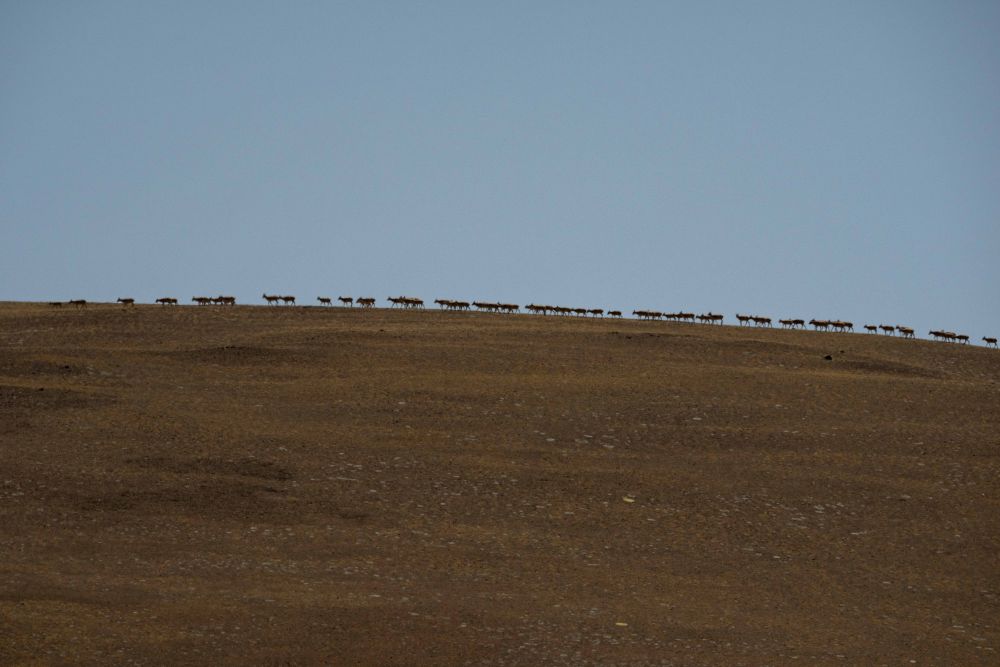 ↑在羌塘国家级自然保护区核心区拍摄的迁徙中的雌藏羚羊群。