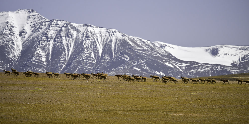 ↑一群雌性藏羚羊在羌塘国家级自然保护区核心区内繁殖迁徙。