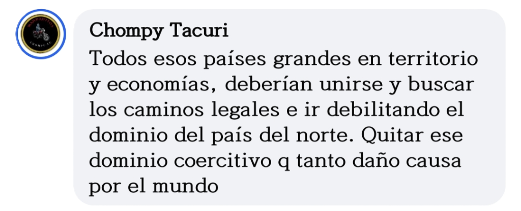 厄瓜多尔网友乔姆皮·塔库里说:“我们应该联合起来,寻求合法的途径,逐步削弱美国的支配地位,终结给世界带来巨大伤害的美国霸权。”