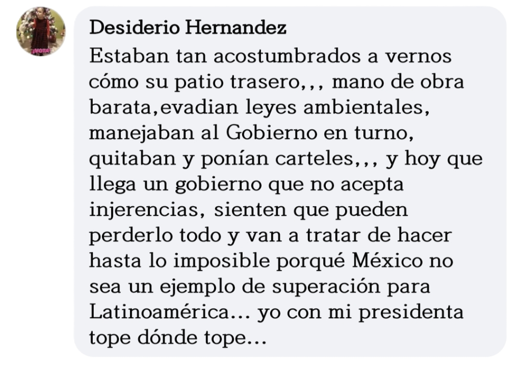 墨西哥网友德西德里奥·埃尔南德斯留言说:“他们(美国)一直将我们看作自己的‘后院’:廉价的劳动力、逃避环保法规、干预政府决策、扶持贩毒集团……他们害怕失去在这里的特权,因此不惜一切代价阻止墨西哥成为拉美国家独立自强的典范。”