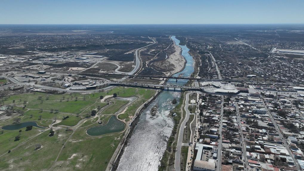 这是2月16日在墨西哥塔毛利帕斯州新拉雷多市拍摄的格兰德河,画面右侧为墨西哥(无人机照片)。新华社记者李梦馨摄