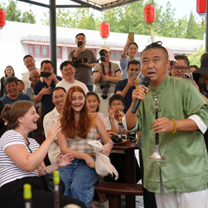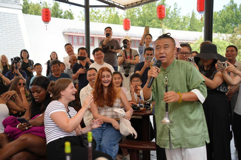 8月9日,河北沧州,非遗传承人何树森的唢呐表演令外国青年们惊叹不已。(宋可柠 摄)