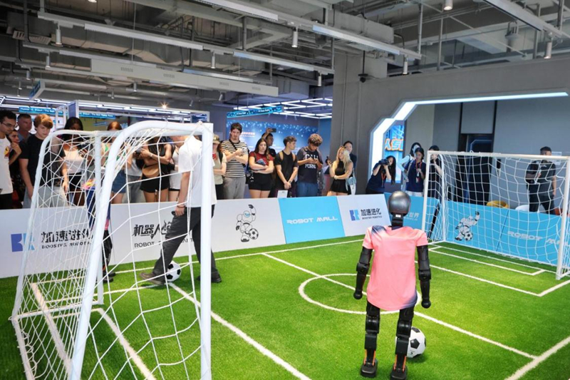 8月7日,外国青年在北京亦庄“机器人大世界”观看机器人足球赛。(林丽园 摄)