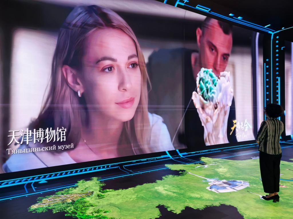 两张巨幅画轴,成为新闻中心的靓丽风景。一张画轴上,上合组织国家旖旎风光、地标建筑、建设成果、文化生活与特色美食等场景绚丽展开,另一张画轴则以天津风物为底,勾勒出现代化大都市的形象。