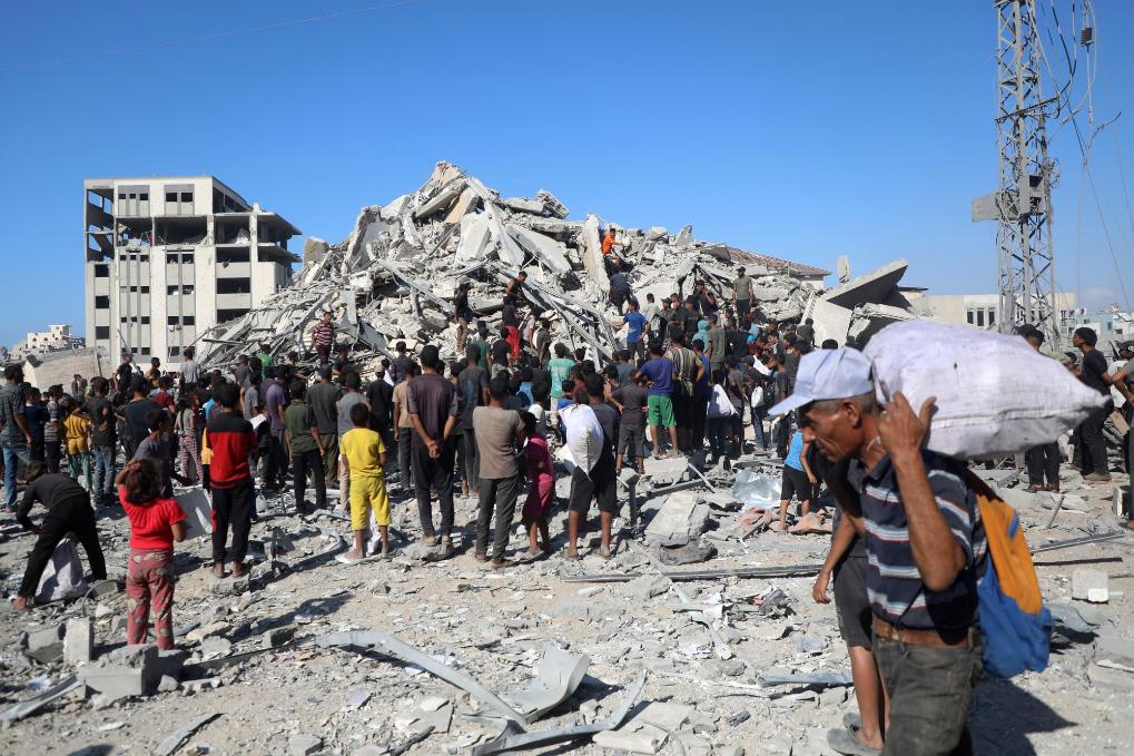 9月8日,人们在加沙城查看一座高层建筑遭以色列军队空袭后的废墟。新华社发(里泽克·阿卜杜勒贾瓦德摄)