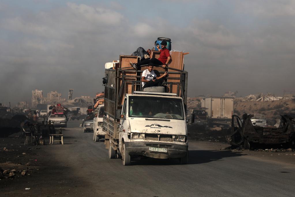 9月9日,巴勒斯坦民众携带物品乘车从加沙地带北部向南部撤离。新华社发(里泽克·阿卜杜勒贾瓦德摄)