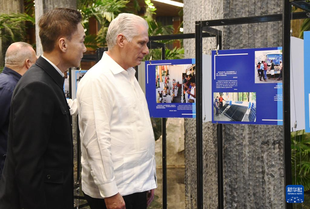 9月29日,在古巴首都哈瓦那革命宫,古巴共产党中央第一书记、国家主席迪亚斯-卡内尔(右)参观中古建交65周年图片展。新华社发(华金·埃尔南德斯摄)