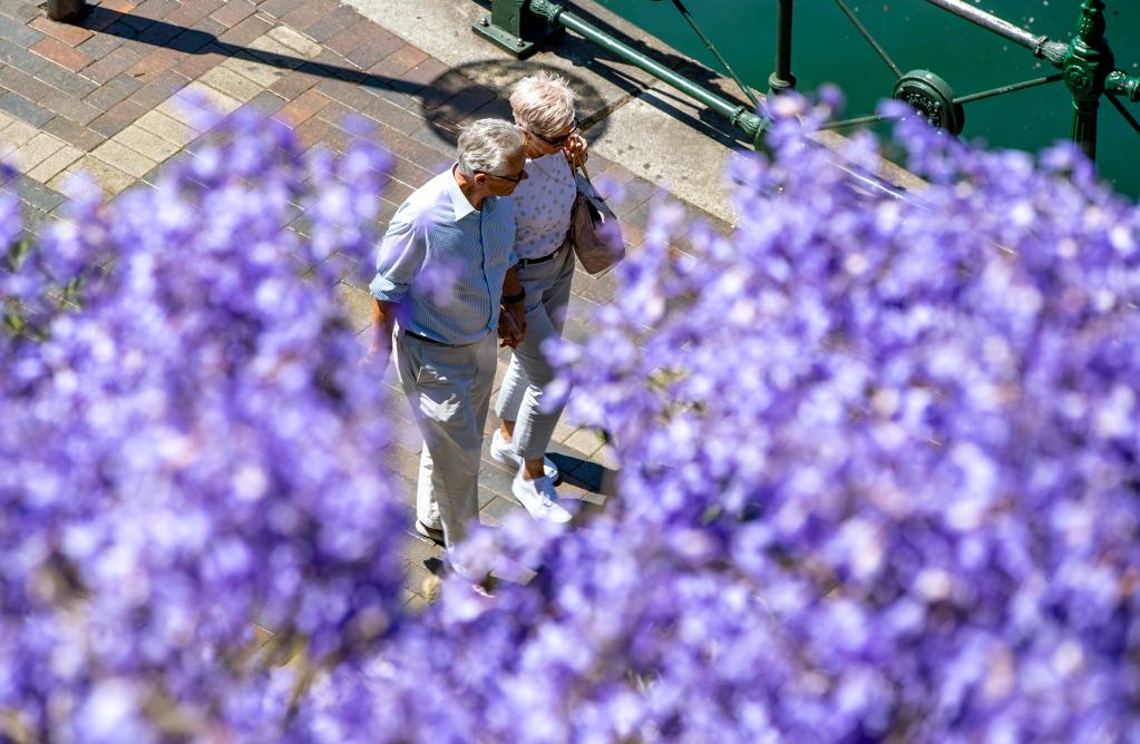 2022年11月7日,在澳大利亚悉尼,人们从蓝花楹树下走过。新华社记者白雪飞摄