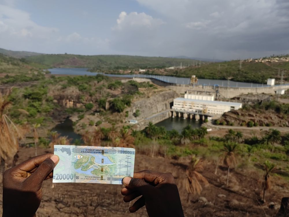 这是2025年4月23日在几内亚以金康水电站为背景拍摄的5000几内亚法郎纸币。