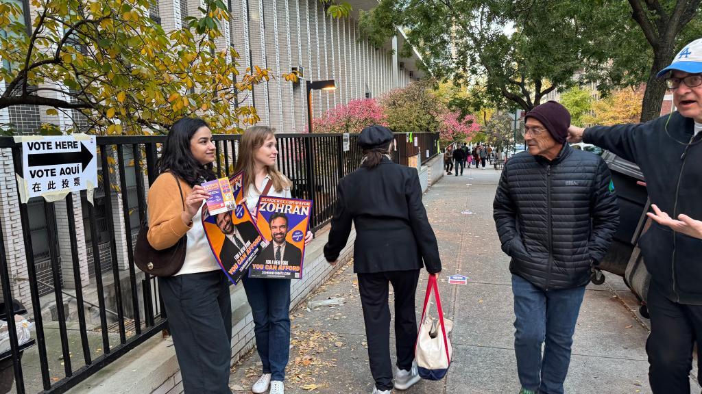 11月4日,支持者在美国纽约一个投票站外手持候选人祖赫兰·马姆达尼的竞选海报(手机拍摄)。新华社发(周焕新摄)