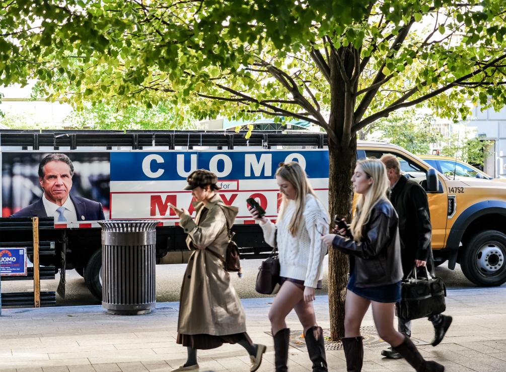 11月4日,在美国纽约,行人经过候选人安德鲁·科莫的竞选海报。新华社发(章正浩摄)