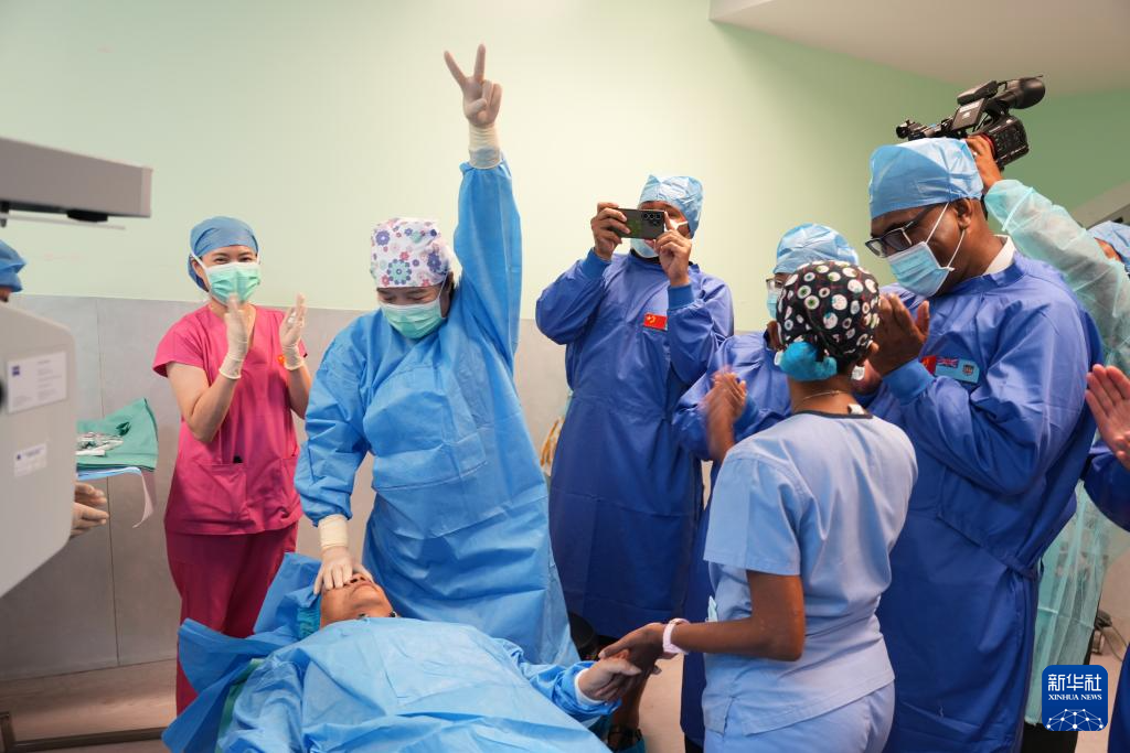 11月7日,在斐济首都苏瓦殖民战争纪念医院,陈伟蓉教授为白内障患者瓦罗穆埃实施手术后,将手高高举过头顶,让患者辨认。新华社发(高鑫摄)