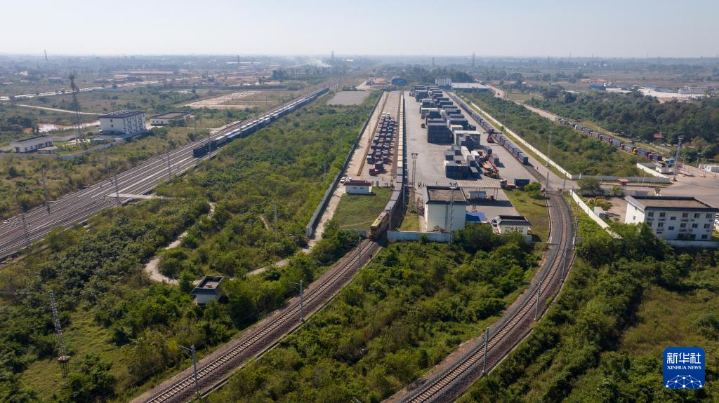 11月29日,在老挝首都万象中老铁路万象南站,发往中国郑州的木薯淀粉班列准备出发(无人机照片)。新华社发(凯乔摄)