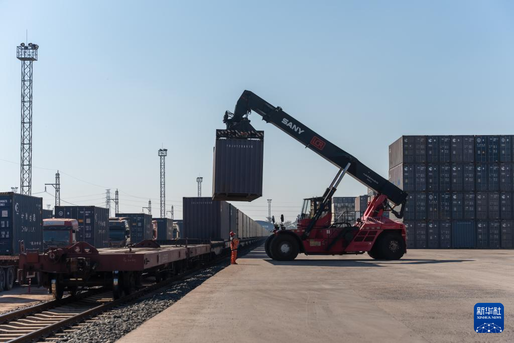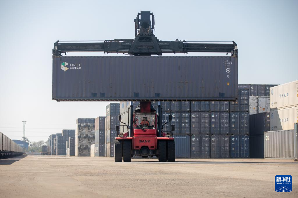 11月29日,在老挝首都万象中老铁路万象南站,工作人员进行集装箱吊装作业。新华社发(凯乔摄)