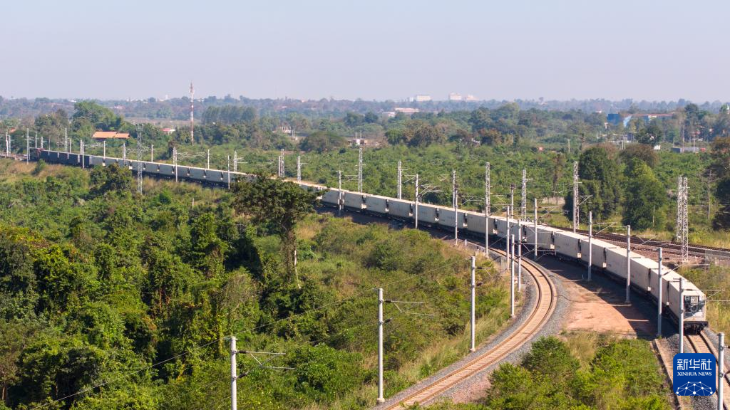 11月29日,发往中国郑州的木薯淀粉班列从老挝首都万象中老铁路万象南站驶出(无人机照片)。新华社发(凯乔摄)