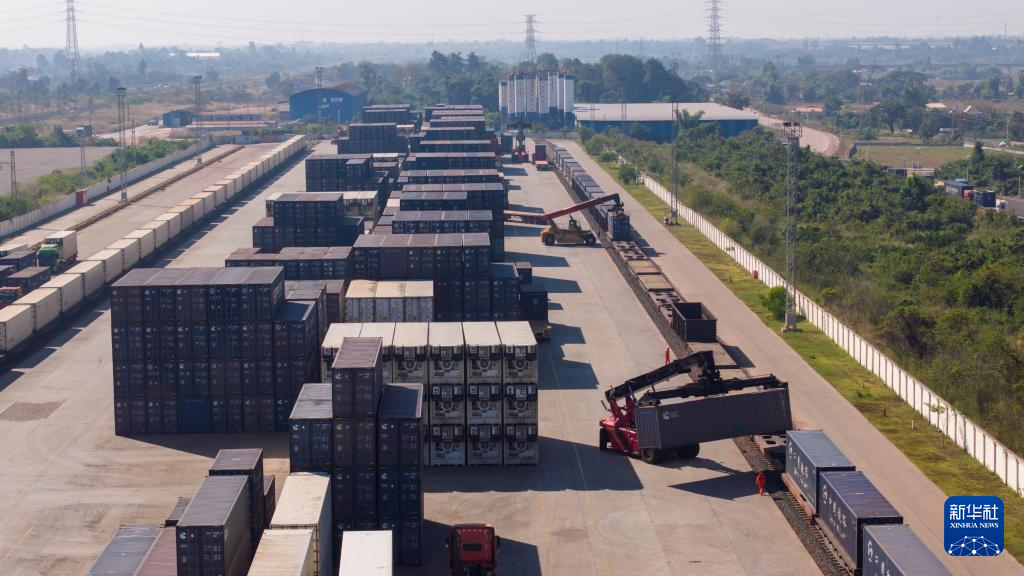 11月29日,在老挝首都万象中老铁路万象南站,工作人员进行集装箱吊装作业(无人机照片)。新华社发(凯乔摄)