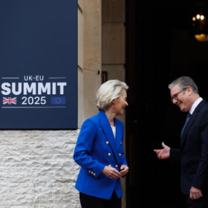 5月19日,英国首相斯塔默(中)在伦敦与欧盟领导人举行会议前同欧盟委员会主席冯德莱恩(左)交谈。新华社发(英国首相府供图)