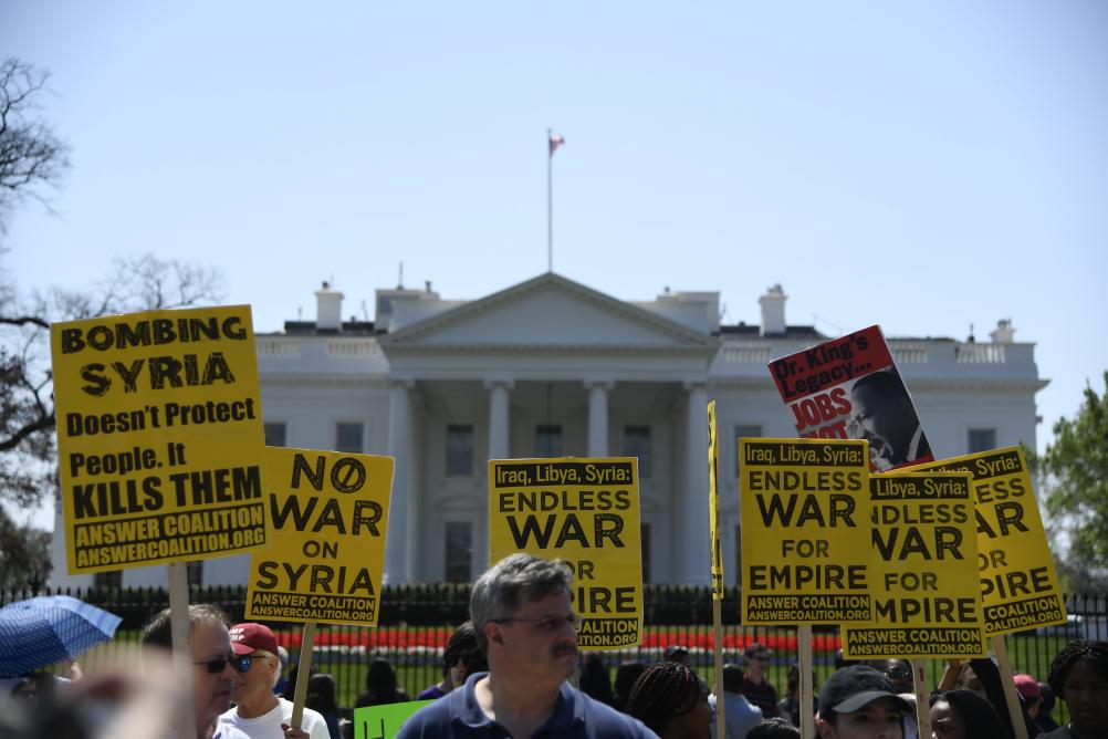 2018年4月14日,在美国华盛顿白宫北侧,人们手持标语抗议对叙利亚进行军事打击。新华社记者杨承霖摄
