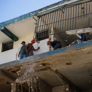2026年1月5日,在委内瑞拉拉瓜伊拉州卡蒂亚拉马尔市索夫莱特社区,工作人员在遭到美国空袭损毁的建筑内进行修缮。美国1月3日凌晨突然对委内瑞拉发起大规模军事行动,入侵委首都加拉加斯以及阿拉瓜州、米兰达州和拉瓜伊拉州等地,强行控制委总统马杜罗及其夫人并将他们带至美国。国际社会对这一恶劣行径予以强烈反对和谴责。新华社发