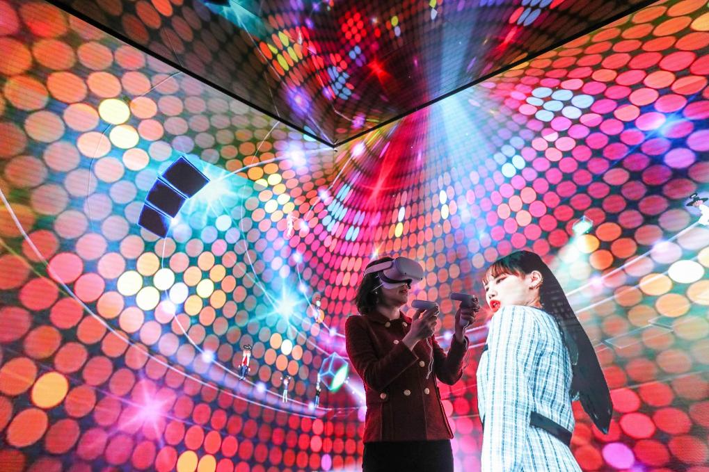 2022年3月1日,一名女子在西班牙巴塞罗那2022世界移动通信大会上通过虚拟现实技术在“元宇宙”中体验音乐会。新华社记者郑焕松摄