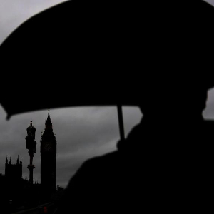 1月27日,一名男子撑伞走在英国伦敦大本钟附近。新华社记者李颖摄