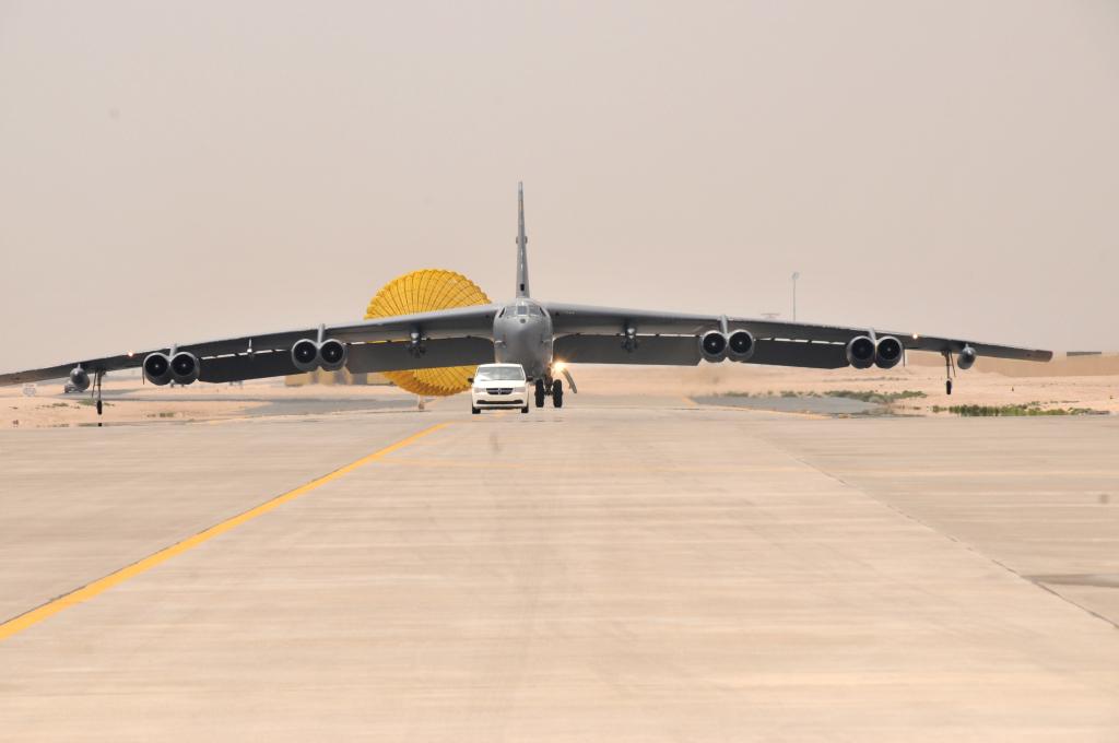 这张拍摄于2016年4月9日的照片显示,一架美国空军的B-52轰炸机抵达卡塔尔乌代德空军基地。新华社/美联