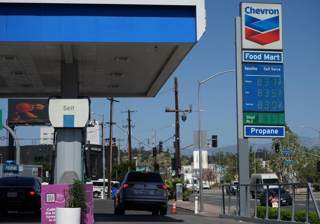 3月9日,车辆在美国加利福尼亚州洛杉矶县的加油站加油。新华社发(曾慧摄)