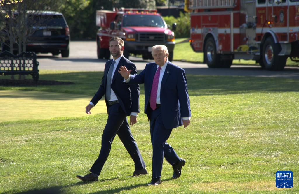 4月10日,美国总统特朗普(右)准备乘直升机离开华盛顿白宫。新华社发(李源清摄)