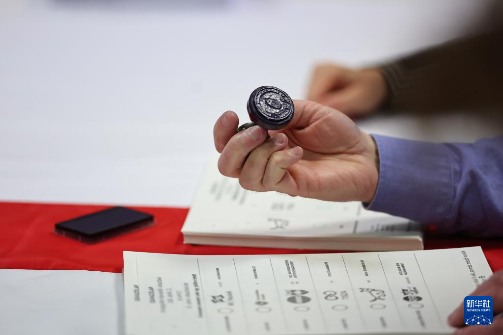 4月12日,在匈牙利布达佩斯,一名工作人员在一处投票站为选票盖章。新华社发(鲍洛格·达维德摄)