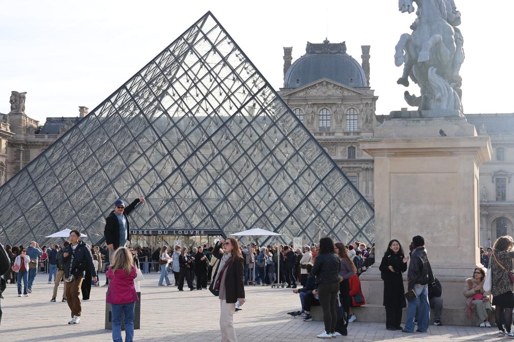 2025年10月22日,在法国巴黎,大量游客聚集在卢浮宫博物馆的玻璃金字塔入口前。新华社记者张百慧摄