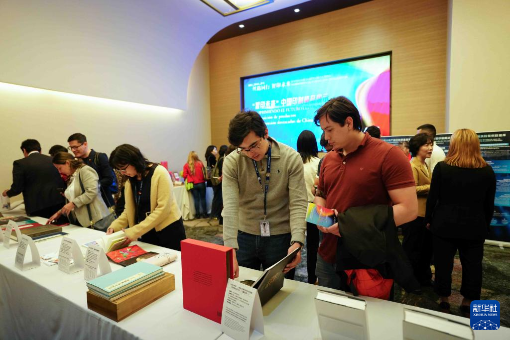 4月27日,在哥伦比亚波哥大,嘉宾在“毕昇印刷合作对话”活动上查看图书。新华社发(安德烈斯·莫雷诺摄)