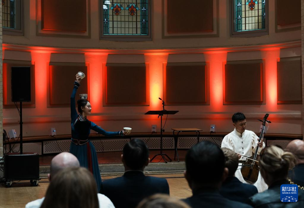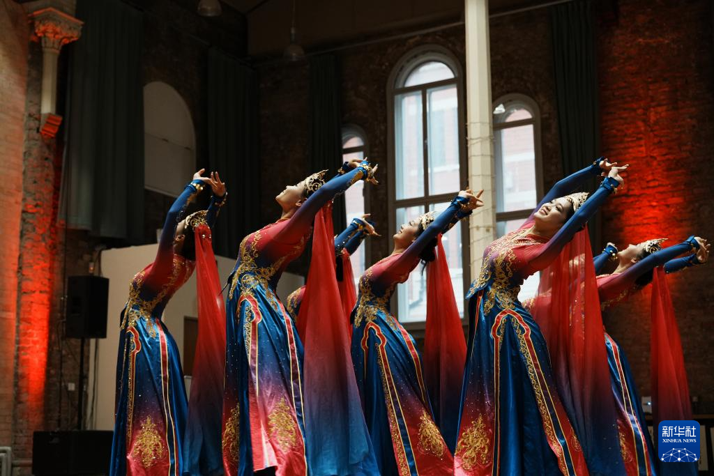 4月27日,在英国曼彻斯特哈雷剧院,中南民族大学艺术团的演员表演节目。 新华社记者 赵家淞 摄