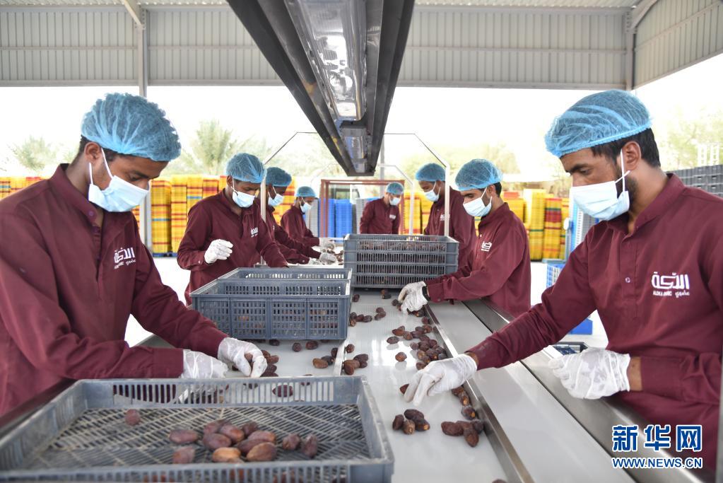 8月12日,工人在沙特阿拉伯加特的一家农场内对采摘的椰枣进行初筛。