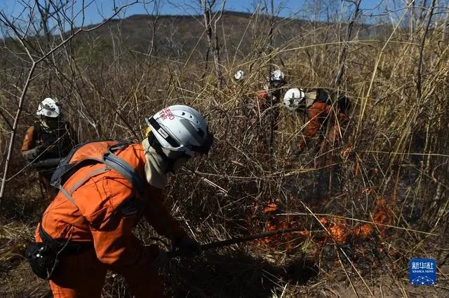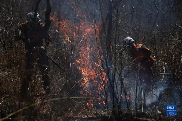 9月22日,消防人员在巴西巴伊亚州里亚尚-达斯内维斯附近进行灭火作业。受持续干旱、高温和大风天气影响,巴西人口大州巴伊亚州发生大面积森林火灾。目前,该州消防部门已派遣数百名消防员和40辆消防车辆、8架飞机努力扑灭大火,以防火势蔓延。新华社发(卢西奥·塔沃拉摄)
