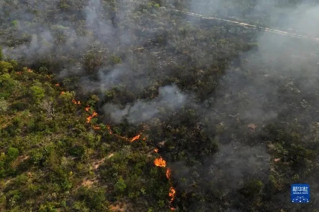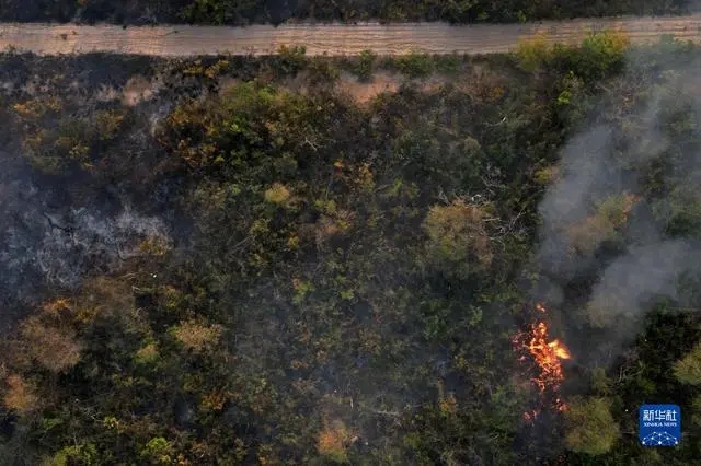 这是9月21日在巴西巴伊亚州巴雷拉斯市附近拍摄的森林火灾现场(无人机照片)。受持续干旱、高温和大风天气影响,巴西人口大州巴伊亚州发生大面积森林火灾。目前,该州消防部门已派遣数百名消防员和40辆消防车辆、8架飞机努力扑灭大火,以防火势蔓延。新华社发(卢西奥·塔沃拉摄)