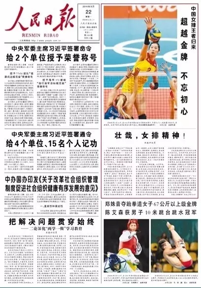 2016年8月21日上午,在里约奥运会女排决赛现场,中国队以3-1战胜塞尔维亚队,为中国代表团拿到了本届奥运会的第26枚金牌。这是中国女排时隔12年再次获得奥运冠军,也是她们第三次获得奥运金牌。8月22日《人民日报》头版和“奥运特刊”又一次聚焦中国女排,诠释新时代的女排精神。