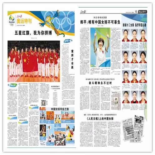 2004年《人民日报》8月30日的“奥运特刊”(图②)上,除了报道新闻外,还配发评论《把光荣写在共和国的旗帜上》,重提女排精神,鼓舞国人士气。