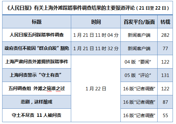 11时04分,人民日报新闻客户端发布稿件《人民日报五问踩踏事件调查》,迅速占领各大网络媒体首页和各大新闻专题页面,人民日报微信公众号结合问责情况开始快讯推送,@人民日报 将相关内容推向微博舆论场,以“五问”形式帮助舆论全面了解事实真相。