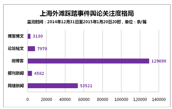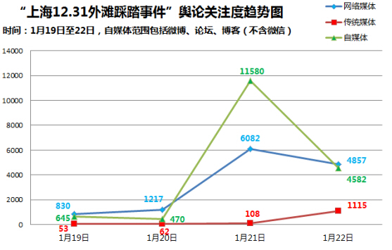 特别需要指出的是,在国家层面整治互联网乱象成效显著的背景下,以激进派网络大V为代表的“舆论泡沫”渐退,主流媒体的互联网议程设置能力越发强大。监测显示,21日至22日,上海外滩踩踏事件的舆情总量达24928条/篇,其中与“人民日报”相关的权重内容近占10%。