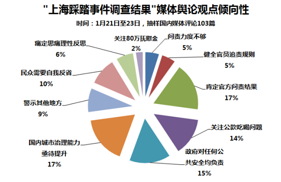 通过对103篇国内媒体评论进行观点倾向性分析发现,上海问责官员、黄浦领导公款吃喝、国内城市治理能力是国内媒体最为关注的三个话题。其中,官员问责是舆论对外滩踩踏事件的核心诉求之一,监测显示,有超过4成的媒体评论关心“上海问责”。