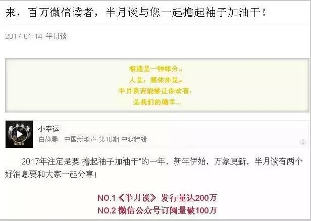 新媒体时代,用户思维至关重要。用户的构成、需要、喜好和阅读习惯,是公众号运营者必须认真思考的事情。比如在用户构成比例方面,半月谈微信的女性用户占56.56%,多于男性用户。基于此,半月谈微信在编发硬新闻的同时,每天发布一篇品读美文,以励志、情感类故事、哲理名言等文章带动阅读量和转发率,收到了良好效果。