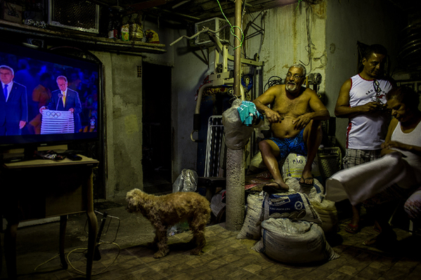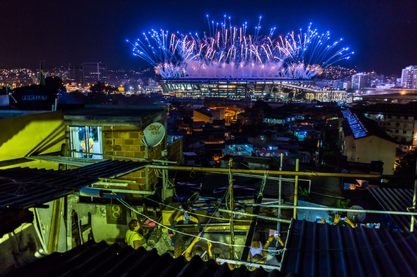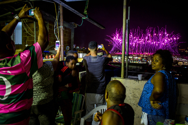 图一:5日傍晚,在通勤大巴数次迷路后,我们终于抵达万众瞩目的马拉卡纳球场。2小时后,里约奥运会将在此正式拉开帷幕。一路都是兴高采烈准备入场的人群,逆着人流,我们背着价值不菲的摄影器材渐行渐远。在地铁站,我们和“道爷”接头。64岁的“道爷”(Adao)头发花白,他是我们今夜的向导和“保护人”,他将带我们钻进山腰上的孟盖拉贫民区,我们将与他和家人一起通过电视观看奥运开幕式。 这是8月5日在巴西里约孟盖拉贫民窟一户人家天台拍摄的奥运会开幕式焰火。