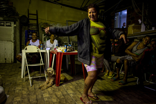 图二:8月5日,居住在巴西里约孟盖拉贫民窟的阿道一家在天台观看奥运会开幕式,家人伴着音乐挑起了舞。 5日傍晚,在通勤大巴数次迷路后,我们终于抵达万众瞩目的马拉卡纳球场。2小时后,里约奥运会将在此正式拉开帷幕。一路都是兴高采烈准备入场的人群,逆着人流,我们背着价值不菲的摄影器材渐行渐远。在地铁站,我们和“道爷”接头。64岁的“道爷”(Adao)头发花白,他是我们今夜的向导和“保护人”,他将带我们钻进山腰上的孟盖拉贫民区,我们将与他和家人一起通过电视观看奥运开幕式。