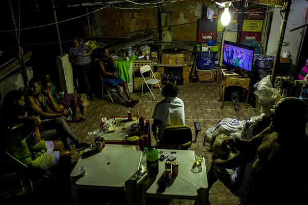 图四:8月5日,居住在巴西里约孟盖拉贫民窟的阿道一家在天台一边晚餐一边观看奥运会开幕式。5日傍晚,在通勤大巴数次迷路后,我们终于抵达万众瞩目的马拉卡纳球场。2小时后,里约奥运会将在此正式拉开帷幕。一路都是兴高采烈准备入场的人群,逆着人流,我们背着价值不菲的摄影器材渐行渐远。在地铁站,我们和“道爷”接头。64岁的“道爷”(Adao)头发花白,他是我们今夜的向导和“保护人”,他将带我们钻进山腰上的孟盖拉贫民区,我们将与他和家人一起通过电视观看奥运开幕式。