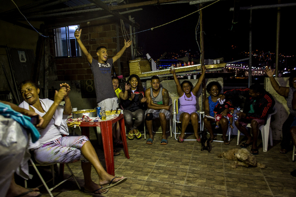 图七:曼盖拉贫民区,一家当地人在奥运会开幕时呐喊狂欢(8月5日摄)。 在2016年里约奥运会开幕时刻,记者深入巴西里约热内卢马拉卡纳体育场对面的曼盖拉贫民区,在开幕式的焰火中体验当地的风土人情,与当地居民一同感受贫民区里的奥运气氛。开幕式的焰火,映照在错落破旧的贫民区房屋间,快乐的身影欢唱着桑巴歌舞,展现着不一样的奥运,不一样的快乐。