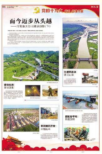 《湖南日报》10月19日02版的报眉设计,将高铁、卫星、火箭与党徽、人民大会堂穹顶、和平鸽、群山等元素结合在一起,其中对高铁、卫星、火箭元素的运用尽显新时代特色。